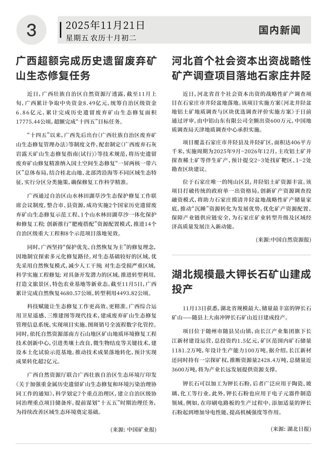 11月13日获悉,湖北省规模最大、储量最丰富的钾长石矿山——随县上大南冲钾长石矿山近日建成投产。项目位于随州市随县吴山镇,由长江产业集团旗下长江新材建设运营,总投资约1.5亿元,矿区范围内矿石储量1181.2万吨。目前,园区一期工程主体结构已完工,即将投入使用,预计可实现年产100万吨钾长石精粉。